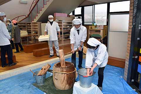 もち米を蒸す様子や、おもちになっていく過程を見たり、また交替でおもちをついたり、丸めたりしてみんなで楽しみました。