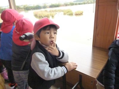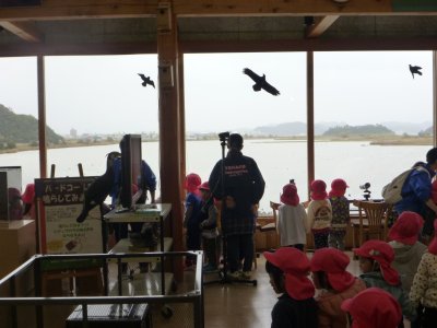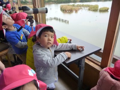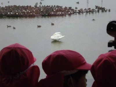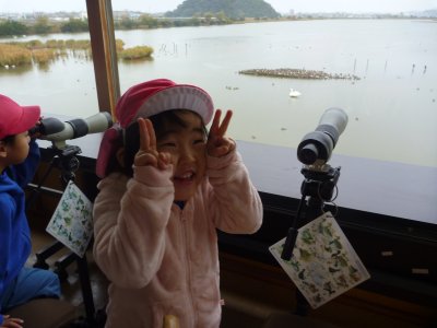 コハクチョウが水鳥公園に飛来している季節との事で、読み聞かせ会が始まる前に、望遠鏡で鳥を観察したり、その他水鳥公園に集まる生き物について話を聴いたりしました。