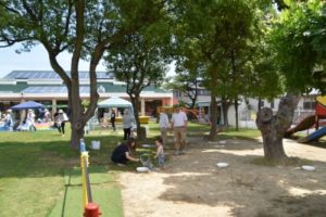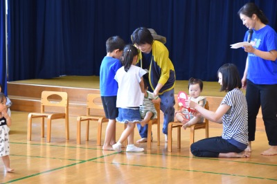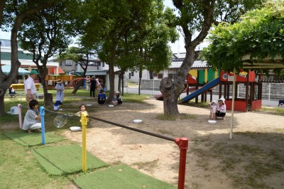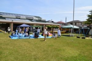 この日は、朝からいい天気で、気温もぐんぐん上がり、とても気持ちのいいお天気の中、水を使って遊ぶことが出来ました。今回は、29組の親子の皆さんが遊びに来てくださいました!