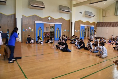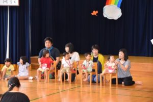 わくわくタイムでは、雨が降ってきて遊びに来たカエルさん、かたつむりさんと一緒に歌ったり、てるてるぼうずさんと一緒に歌っていたら、晴れてきて、虹が出てきて…「にじのむこうに」を年長のお兄さん、お姉さんと一緒に歌ったりしました。