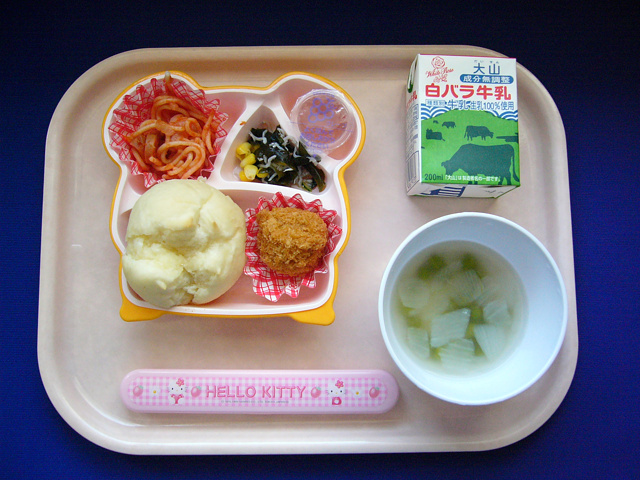 スパゲティの定番★ナポリタン★(2013/05/17) ★ パン ◆●えんどう豆スープ ★◆●ナポリタン ★●ころころコロッケ ◆●海藻サラダ ★ ゼリー ※あたたかいスープはおかわり自由です。 ※牛乳は希望者のみです。 ★熱や力になるもの ◆血や肉になるもの ●体の調子を整えるもの ツイート