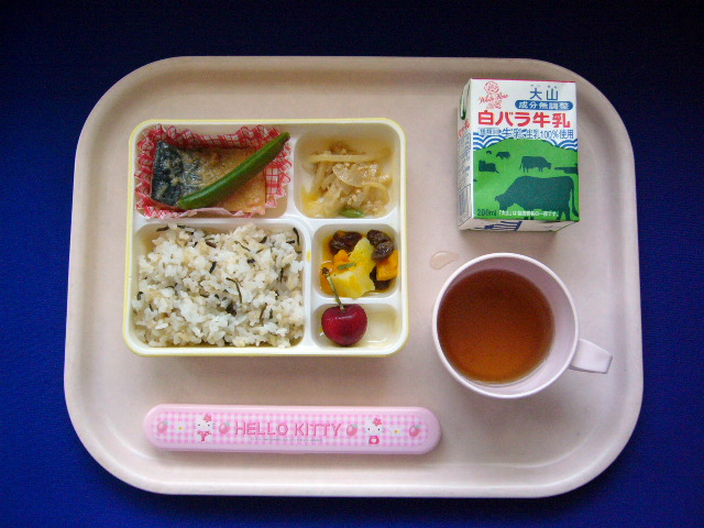 ★ カリカリ梅と昆布のご飯 ◆ さばの味噌煮 ◆●たけのこきんぴら ★●かぼちゃサラダ ● チェリー