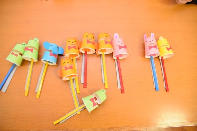 今回のおみやげは、紙コップで作ったパクパク人形です。