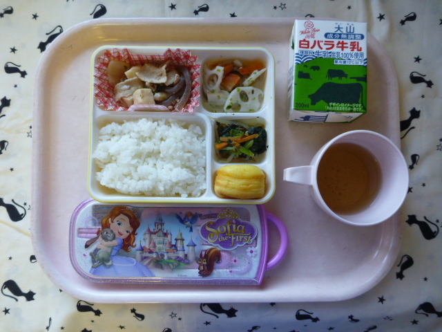 磯の香りのシャキッとれんこん★(2019/11/29) ★ ごはん◆●すき焼風煮◆●れんこんのり塩炒め◆●おかか和え★ プチケーキ ※あたたかいご飯はおかわり自由です。※牛乳は年長希望者のみです。★熱や力になるもの ◆血や肉になるもの ●体の調子を整えるもの ツイート